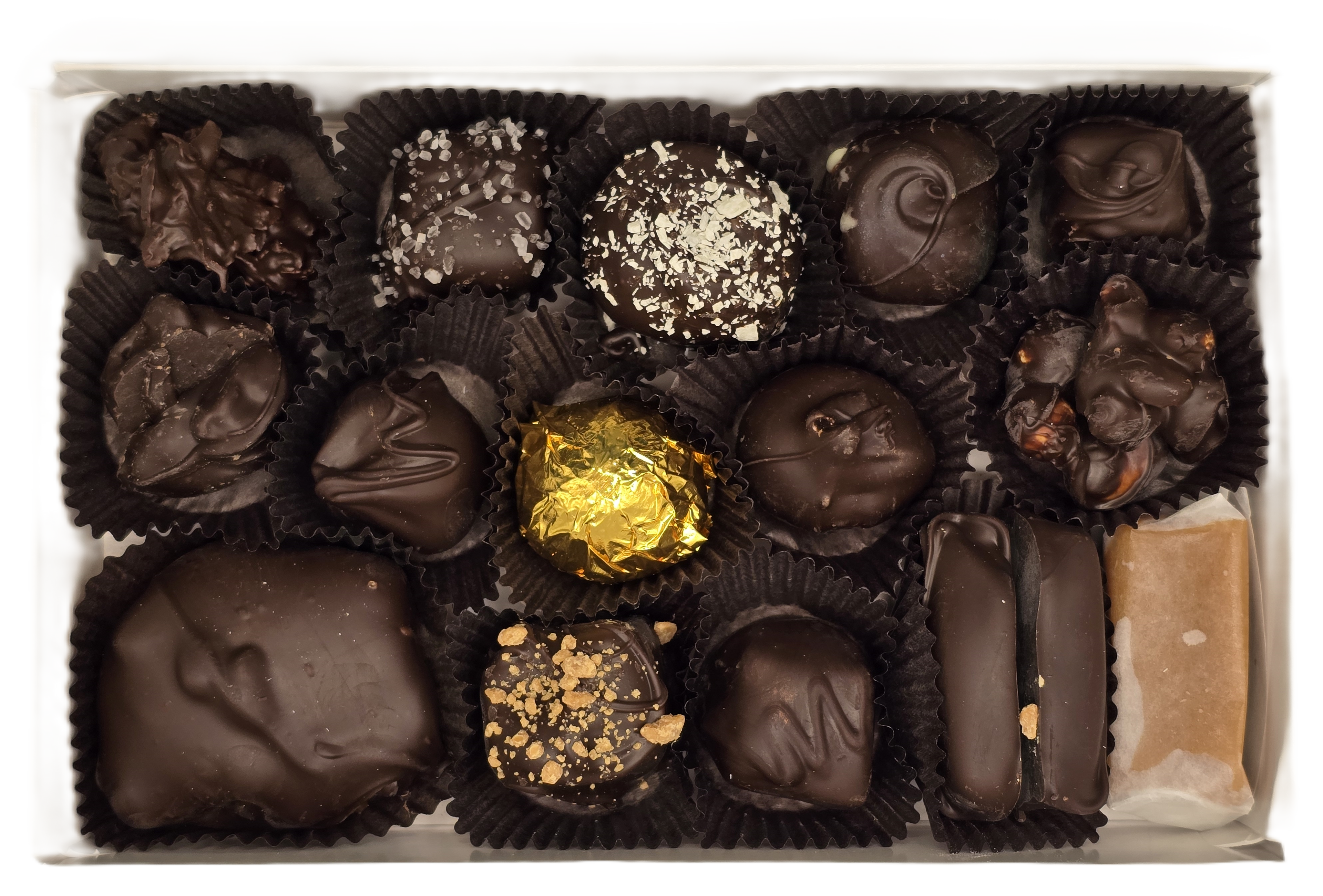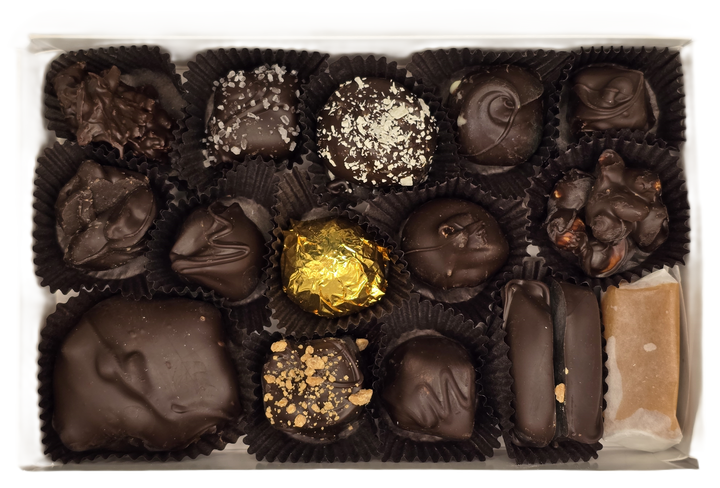 Indulge in a variety of our hand dipped dark chocolates, thoughtfully arranged to offer a taste of every flavor. Choose from 8 oz, 1 pound, or 2 pound boxes.