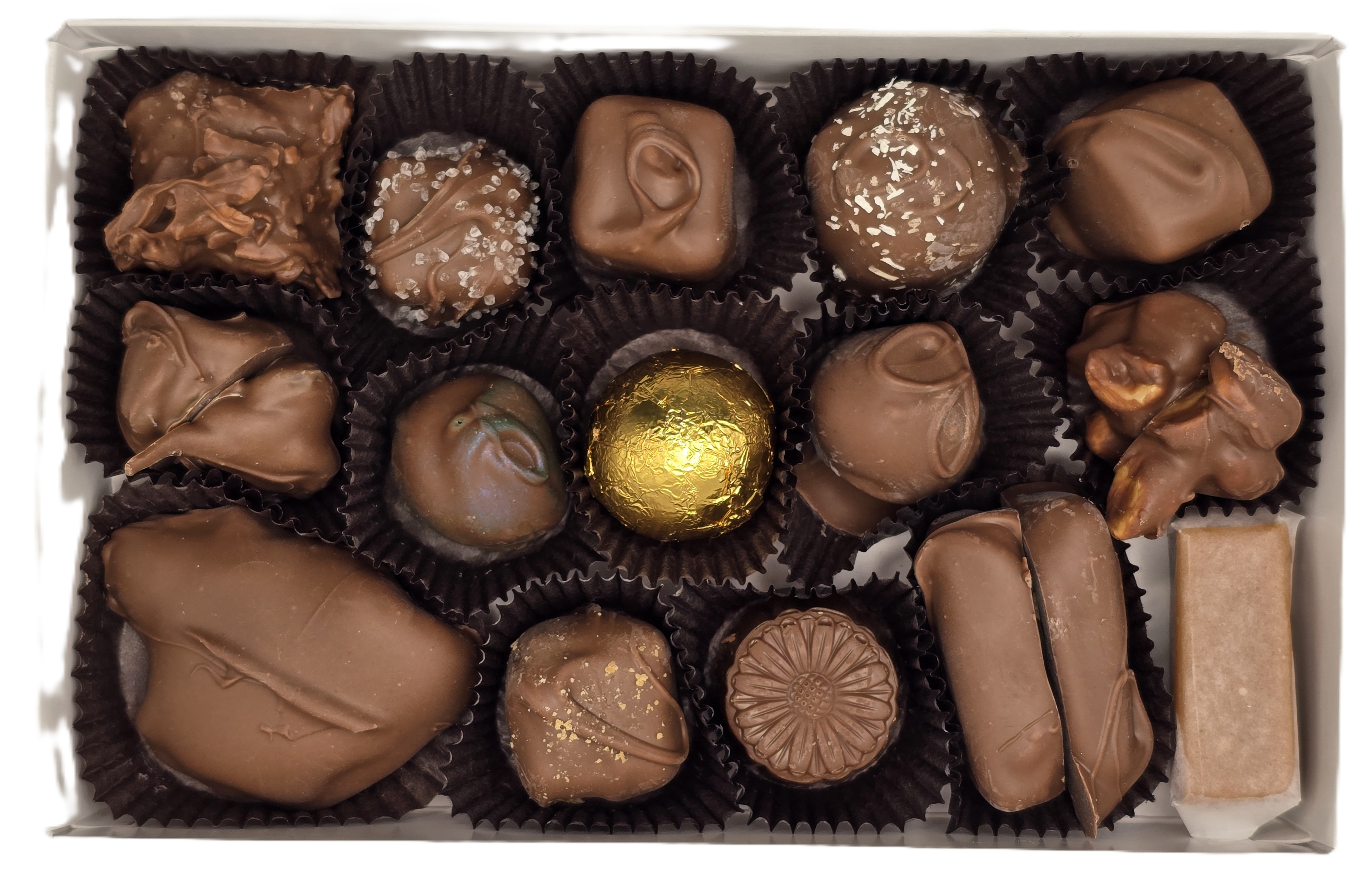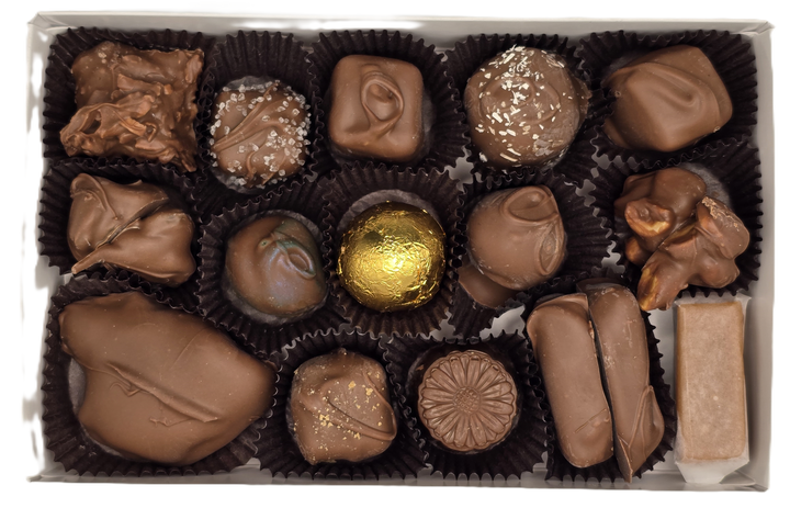 Indulge in a variety of our hand dipped milk chocolates, thoughtfully arranged to offer a taste of every flavor. Choose from 8 oz, 1 pound, or 2 pound boxes.