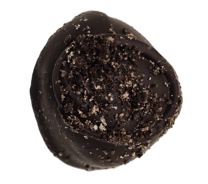 Crushed cookie and cream filling surrounded by dark chocolate.