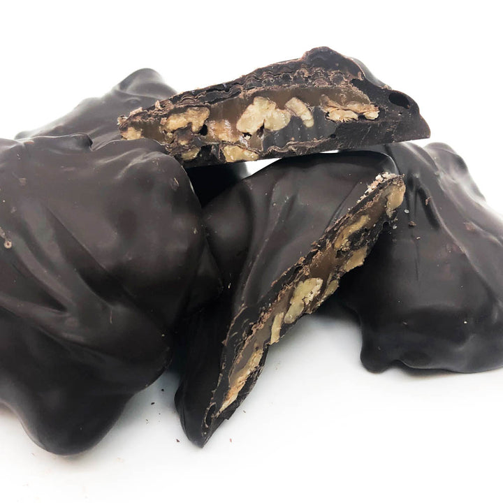 Crunchy pecans clustered together and smothered in caramel then covered with the most delicious dark chocolate.