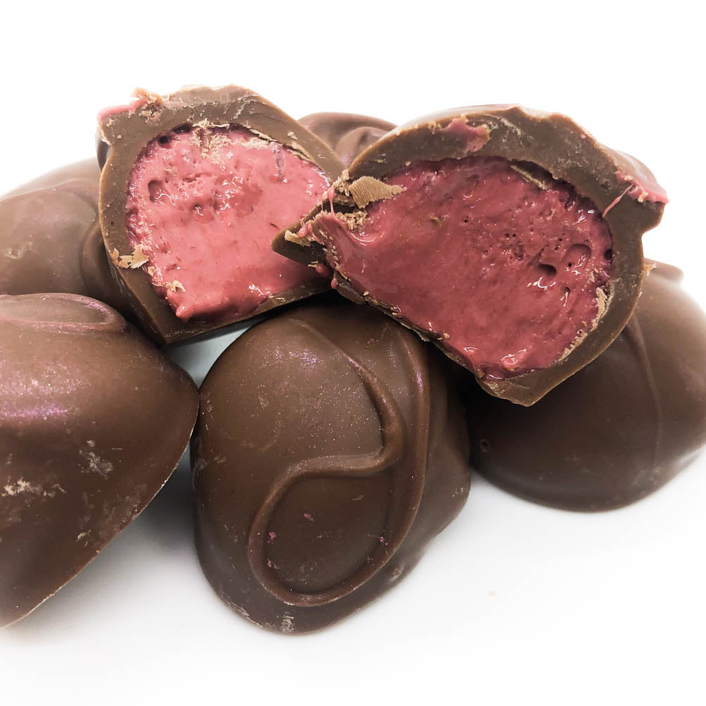 Sweet, tangy, raspberry flavored cream encased in a smooth, milk chocolate shell.