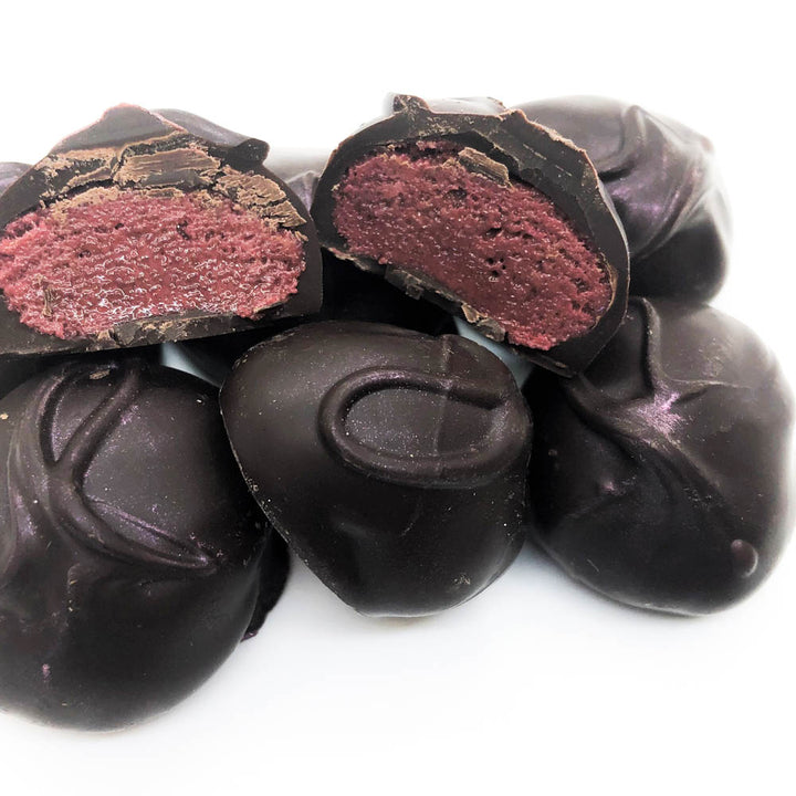 Sweet, tangy, raspberry flavored cream encased in a rich semi sweet dark chocolate.