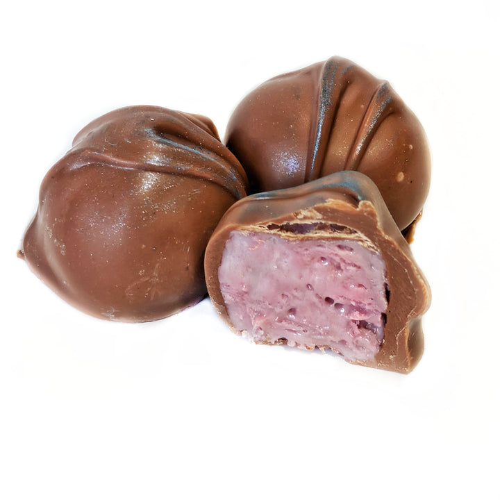 Smooth , rich milk chocolate provides a comforting, sweet base that contrasts with the tangy, bright flavors of blueberry and pomegranate.