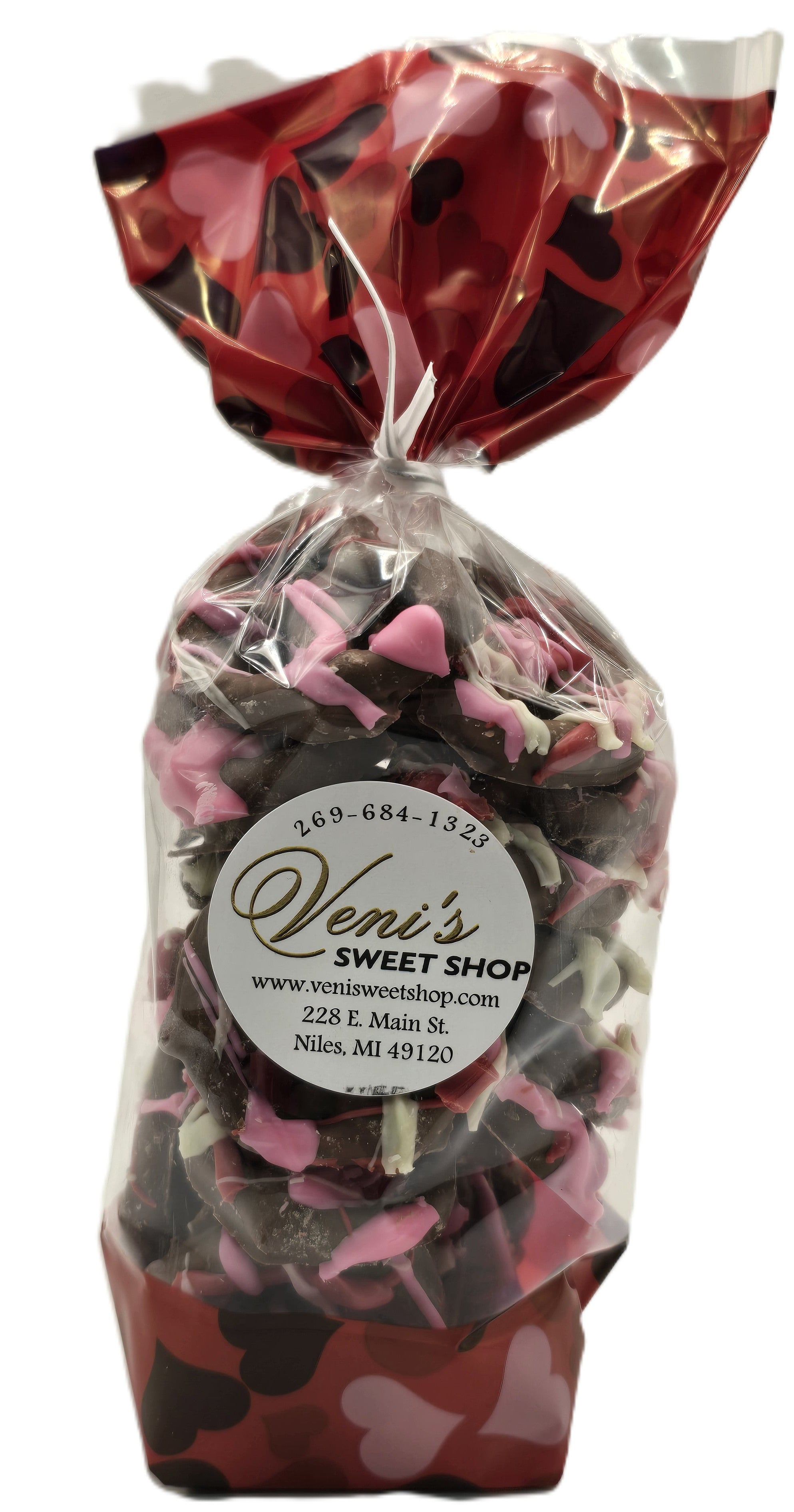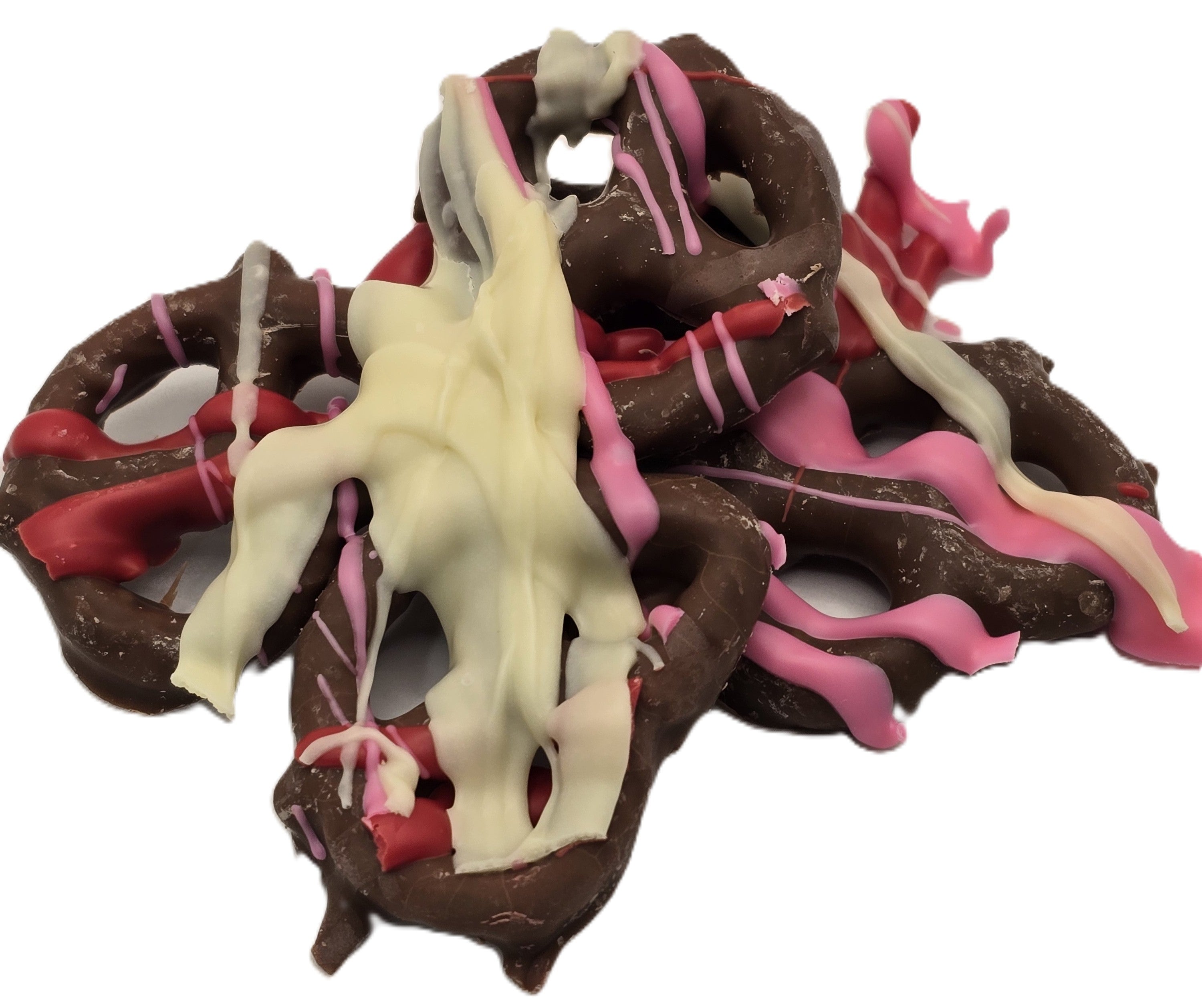 Indulge in the irresistible combination of crunchy pretzels and creamy milk chocolate, adorned with festive pink, red, and white chocolate drizzles.